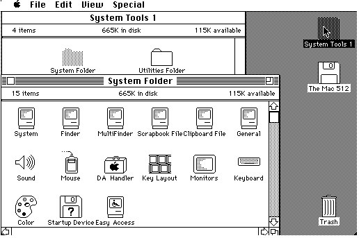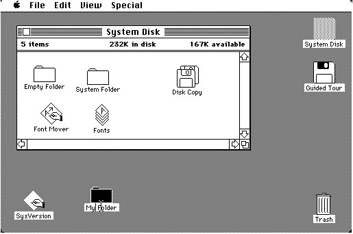 System 1.0是苹果最早的操作系统,发布于1984年1月,一经出世就已经具备了图形操作界面,含有桌面、窗口 、图标、光标、菜单和卷动栏等项目。