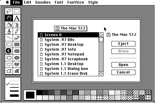 System 1.0的功能相对简单,当时并不能从菜单中建立新的文件夹。后来苹果发布了OS 1.1对1.0存在的问题进行了修复同时更新了一些软件。