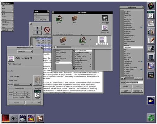 Mach核心在当时非常独特。它远比当时的Unix相容核心更加有弹性、结构也更为先进。这些特质吸引了乔布斯的注意,他和Mach开发的中心人物Tevanian合作,很快为NeXT开发了NeXTSTEP,一个NeXT电脑用的新图形操作系统,这系统随后在 1988 年正式发表。1996年11月,得知Apple正在向外部寻找下一代OS,乔布斯又回到了Apple,和管理层进行谈判,后来在12月20日Apple发表声明以4.3亿美金收购NeXT,并采用NeXTSTEP作为下一代 OS的基础技术,同时乔布斯也会担任Apple的顾问。在这场转变中,乔布斯回到了Apple,而且新一代的Mac OS基础也有了。