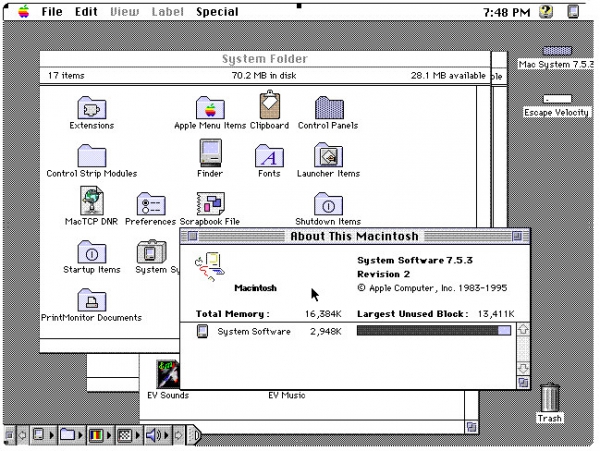 System 7比上一代可以说经历了很大的更新,也是第一个支持彩色显示的苹果系统,图标上面终于有了256中颜色,而且还有支持多媒体的Quick Time,互联网络功能也开始引入。