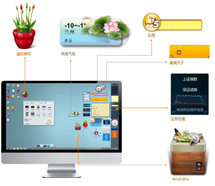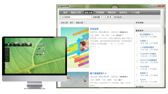 (1)酷鱼桌面:一个丰富widget平台,网页嵌入形式,皮肤主题和widget通过云端加载,减小软件容量。