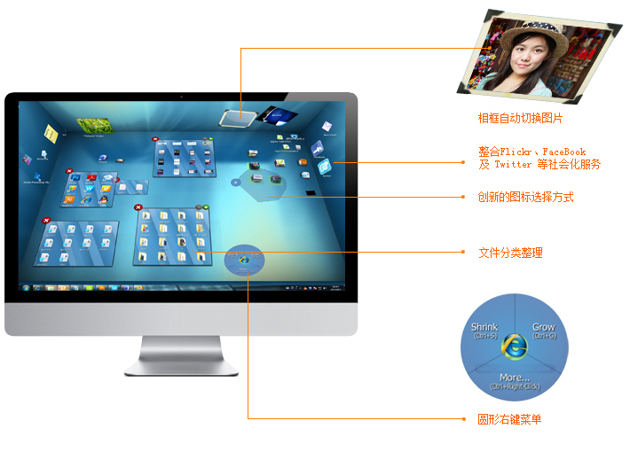 (1)最大特色:3D立体空间,设计风格偏干净简洁型,图标有变形拉伸,视觉阅读性比较差。鼠标可任意去框选图标功能和区别于微软的右键圆形菜单也算是俩个小亮点。
