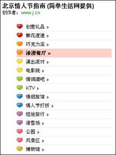 发表者:谷歌中国公关部 情人节将至,如果你准备了玫瑰、烛光晚餐和巧克力这老三样,那可就有点过时啦,其实情人节可以过得更丰富多样:与心爱的人一起欣赏一场卓有口碑的话剧《茶馆》;在云雾缭绕的五台山顶为爱情祈福;或是在北京胡同深处青砖灰瓦的四合院酒吧品一把现代文化与古老传统的冲击,谷歌中国与简单生活网联合发布的“北京情人节地图”给你更多的情人节的浪漫构想。 “北京情人节地图”已经上线,这张为恋人们特别打造的情人节专属地图为北京地区的网民提供了 15 种节日选择,包括简单生活网(j.cn)优选出来的近 400 条经过人工查询、收录、筛选的情人节热门服务信息,其中既有“创意礼品”、“鲜花速递”、“巧克力店”等礼物的信息,也有“情调酒吧”、“短途旅行”、“演出派对”等活动的建议。 点击谷歌地图首页(ditu.google.cn)左侧的“北京情人节指南”即可进入“北京情人节地图” 点击“北京情人节地图”左侧的 15 个彩色心型标识中的一个,地图中立刻显示出创意礼品、浪漫餐厅等分类信息的蓝色标签。 点击每个标签,你会看到一个餐厅、礼品店、剧院或者公园的地址、价格、特色等相关信息。无论你做出什么选择,到情人节那天,满街的浪漫空气中,你都将是其中的一个浪漫因子。 谷歌地图是一个开放的平台,我们已经筛选了一大批具备优质内容和优质服务的网站与我们合作,现在,谷歌地图已经可以为网民提供餐饮、购物、健康、旅游、娱乐、教育等多个方面的与地理位置相关的生活信息,你可以在谷歌地图的“类别”标签页看到我们目前可以提供的分类信息。我们的目标,是与更多的优质网站合作,让更多的人分享生活信息服务,让我们的服务越来越丰富和越来越实用,让谷歌地图成为你的一个生活小助手。
