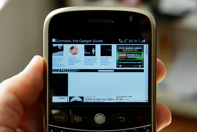 Bold 内置的浏览器比原来使用多年的黑莓浏览器有了长足的进步。大多数的网站的显示比较正确,只是对scripts的支持不太好,有时有点小问题,所以访问 Wikipedia和华尔街日报网站耗时较长。它的缩放采用键盘对应的方式,使用起来很不错,但是使用轨迹球的操作,拇指的键程过长了。网页的分栏显示功能把完整页面转换成适合单栏显示的形式,相当方便,这种方式处理较宽的网页比较方便。但并不是所有的网站都适合这样的显示(Wikipedia的显示不错,Gizmodo的显示就很难看)。希望他们能在Storm采用的下一代浏览器中改进script的性能。我弱弱地建议,把自己的浏览器扔掉吧,采用 Webkit的浏览器会打开一片新天地。