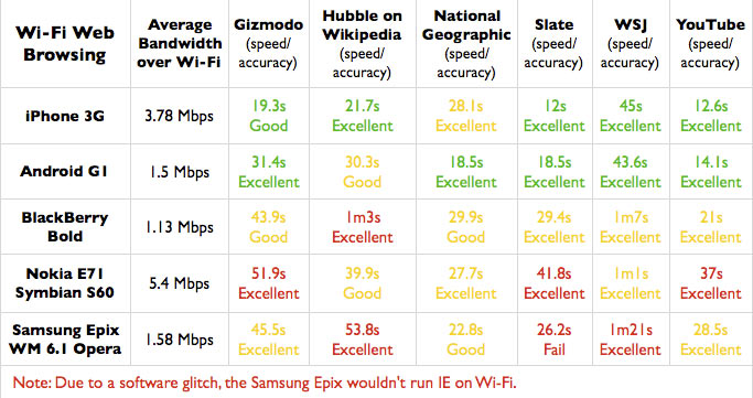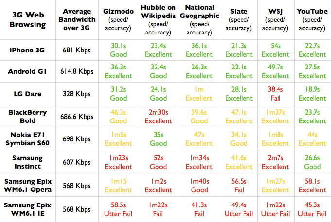 一些要说明的问题:WiFi网络下无法使用IE,Opera和Skyfire都没问题。我们没有细究这个问题,原因是IE在3G网络下的表现——不管加载速度又多快,页面根本没法看。 Sprint改进型Instinct和Verzon的Dare是我们觉得特色手机最优秀的代表,但它不支持Wi-Fi。Opera Mini和Skyfire也没有测试,因为他们是通过服务器的图片渲染模式来处理网页,而且我们不认为这种使用代理服务器来处理网页的浏览器会活得很久。