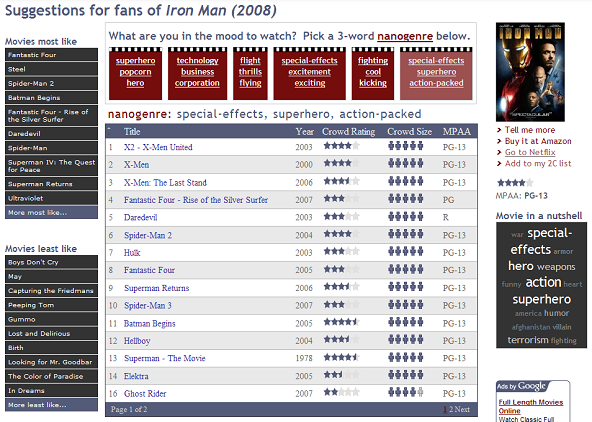 无需注册或登录即可使用,访问网站主页,如果你想看某类电影,输入此类中一个电影名字,最后是选择 nanogenre,(即选择一个词汇组,其中包含 3 个词),就可以得到电影推荐列表。这个结果列表,在我看来,的确有用。如果选择不同的 nanogenre,返回的结果将非常不同。这点令人惊奇。