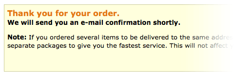 用户可能完成了商品订购并付款了,但其实还没结束。网站需要发一封确认邮件,告知用户购买商品的详细信息和送货到达的时间。这个信息还是很有帮助的,因为这让用户再次确定他们没买错商品,比较安心。 亚马逊网站会在用户付款后,发送关于购买的商品详细信息的邮件,并告诉用户如果买错,如何在商品发货前修改。 如果用户买错了商品,在商品发货前,需要提供给他们重新登陆并返回修改订单的机会。简单的出错,比如选择错了尺寸,颜色,经常会发生,所以网站需要让用户感觉在线上购物既简单又可靠。