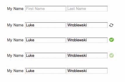 图9.3 实时确认正确答案有优点,所以禁不住会对表单所有问题都使用即时验证。为什么不让人们知道每个问题都回答正确呢?他们填完表,不会发生错误! 图9.4采用的做法,赞成和反对意见我都听过。一方面,实时验证所有输入框,确保一次性正确完成表单。另一方面,验证所有输入框会分散注意力,用户也会吃惊。