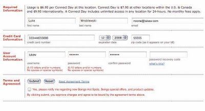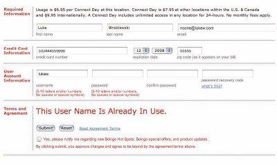 尽管表单问题清晰,而且提供有意义的输入暗示,但总有些问题答案不止一个。此时,直接反馈可再次让人们确信答案有效。经常采用即时验证方法实施这种实时沟通。 即时验证提供多种类型反馈:确认合适答案,建议有效答案,实时更新输入范围限制。这些反馈通常发生在输入答案开始,继续或停止的时候。 确认 如果人们很可能不知道答案是否正确,确认答案是否有效最有用。选择用户名是常见例子。用户首先想到的用户名已被使用,这种情况经常发生。用户提供特定答案会发生错误,因为网站认为答案“无效”,别人已用了此用户名。填注册表单时,人们不可能知道哪些用户名可选择,不得不一直猜,直到偶然发现某个模糊用户名还没被使用。 如果表单无法提供帮助,情况会更糟。图9.1,Boingo网站,没有反馈帮助用户找到有效答案,告诉用户发生错误的反馈也很不明显,因为反馈字体和颜色和标签相同(参见第8章关于错误消息的章节)。