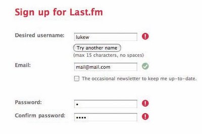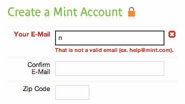 图9.4 验证电子邮件是指电子邮件地址的格式是否正确,还是指验证是不是我的电子邮件地址,还是指网站已经知道这个电子邮件地址(如果注册或更新客户记录的时候尤其重要)?不是所有人都这样思考,但是为什么要让用户思考?即时验证能帮助人们填写他们无法知道有效性的答案。我知道我的名字,根本无需验证! 如果要即时验证很多问题,时机是关键。图9.5,Mint网站注册表单,用户填写发生错误,错误提示立刻出现。我刚输入电子邮件的第一个字母,就出现错误提示。只在用户填写结束后才提供反馈,这种做法更好。图9.6,用户填写Yahoo!注册表单的过程。