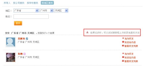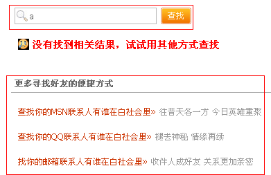 搜索后是关于搜索结果的处理与搜索结果的展示: 搜索结果有3种情况: 1是用户找到他想要的信息,这是最好的结果; 2是结果太多,用户需要再次过滤;.(在写这篇文章的时候,我们的项目在搜索这块还需优化,只能借鉴其他的网站.),还是以白社会为例:如下图中的提示,"结果过多时,可以试试搜索框上方的其他查找方法",便是一种引导,不过这做得还不够好,因为我觉得应该是对搜索结果的再次过滤,比如,增加搜索条件,在年龄,性别,在线等方面进行过滤,而不是引导进行其他方式的搜索.