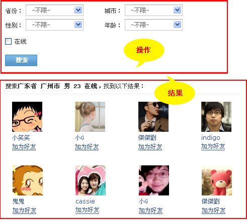 好友搜索,结果在当前页中显示。 搜索结果与搜索条件在同一页面显示,比页面跳转的交互会更好,同时支持再次搜索。