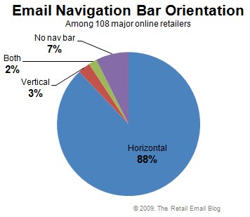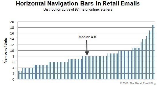 水平导航条远远多于垂直的,因为在邮件预览窗格中,水平导航条更容易被完整地看到,有助于提高其效果。 邮件导航条必须与网站的导航条相一致吗? 对大多数邮件营销者来说,要决定包含导航条比较容易,但对于导航条是否要与其网站的导航相一致,许多人会不确定。在包含导航条的零售商中,38%采用了与网站相一致的邮件导航条。 我们的看法是,邮件和在线营销的差异,正在于两者导航上的差异。邮件没有网站那么宽泛,用户在邮件上花的时间较少,这需要邮件能被快速浏览。我们推荐在建立邮件导航条时,能考虑这些差异。 导航条链接的数量 邮件与网站在导航上的差异,意味着邮件导航要比网站导航,含有更少的链接。 目前,零售网站导航条链接的平均数是8.9,而水平方向的邮件导航条链接的平均数是8.1。但是,链接数量的范围从3直到19,垂直方向的邮件导航条平均有23.2个链接,范围是从6到50。 “这些数字对我来说好像高了点,”Smith说。“我推荐挑选5、6个能体现网站目的地的链接,把它们加在你邮件的导航条中。”