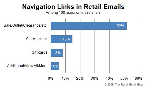 有趣的是,在导航条中含有9个或更多链接的零售商中,有59%是复制了网站的导航条,而那些邮件导航条链接更少的零售商,更多地使用邮件特定的导航条。复制网站导航,也许是受了来自销售区经理和推销商的压力,但这些更长的导航条削弱了更好的效果。 其他导航链接 除了导航条的链接,我们也研究了零售商在邮件顶部放置的导航链接,不管这些链接在导航条里,或者在正文之前的任何地方。例如,我们发现,52%的零售商放置了一个连到其销售、批发商店或清仓甩卖销售区的链接。15%有连到其商店位置的链接,8%有连到其礼品卡页面的链接。 由于92%的零售商在邮件导航条中,使用了与其网站导航条数量相同或更少的链接,因此有趣的是,我们看到有6%的零售商放置了一个“更多”、“查看全部”或类似连到各销售区的链接。对于销售区很多的零售商来说,这是一种值得考虑的方法。