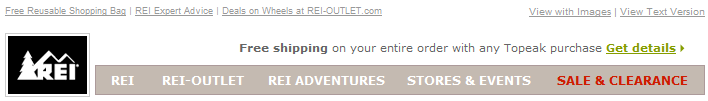 导航条的技巧 你邮件导航条中的各链接无需同样地设置,你的导航条也不必在你邮件程序中固定不变。想象一下,这也许也很不错,如改变链接的顺序,或以不同的颜色突出不同的链接。以下是可以为导航增加点趣味的三种技巧: 突出“销售”链接 销售几乎永远是订阅者的兴趣,所以可以考虑对您的“销售”、“清仓”或“特卖”链接,给予一种特殊的处理。Alloy、eBags、REI和Spiegel等少数大零售商就是这么做的。 “我们发现,把‘销售’链接渲染为红色,是推动销售的有效手段,”Smith-Harmon的共同创始人和总裁Lisa Harmon说。