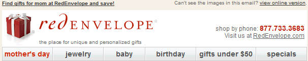 展示季节性销售区 改变你的导航,还有季节性的机会。比如,在母亲节到来之际,RedEnvelope在导航条里增加了一个红色“母亲节”链接,作为第一个标签。FTD和SmartBargains也增加了“母亲节”链接,吸引对母亲礼物的注意。