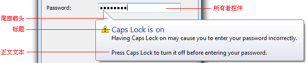1.例如大写锁定键(Caps Lock)开启状态,密码框的气球状提示(参见图1)。所有者控件处于某种影响输入的状态,该状态可能不是用户所期望的,但用户也许没有意识到其输入所受的影响。当出现特殊情况时(如超过最大输入字符数或大写锁定被启用等),在第一时间使用气球状提示进行警告可以防止用户产生挫败感。它在给出反馈信息的同时,不改变输入焦点,不强迫用户进行操作。这一点非常重要,因为这些特殊情况有可能是故意为之的。这些气球状提示对于密码框尤为重要,因为用户在密码框中输入时只能得到很少的反馈。此类气球状提示带有警告图标。