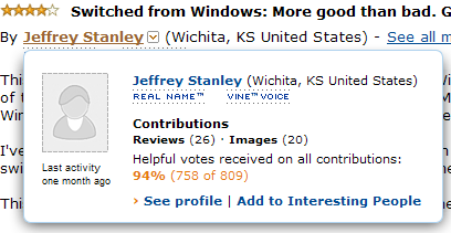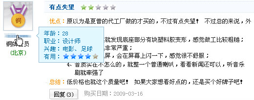这里触发条件是鼠标hover时,触发Balloons(气球状提示).显示评论者的相关信息.这里的应用是信息提示,但却是应用了气球状提示的形式.在Amazon的商品评论里也有类似的提示,不过它不是气球状提示,在那里它承载了更多的交互和文字链.如图9.