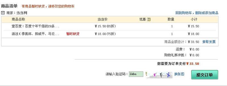 我点击一次提交订单,左边的验证码换一次,点击一次换一次,总是到不了成功页面。我以为是提交订单和换张图响应了同一个事件,就这样傻傻的试了不下10次,在换张图和提交订单之间。直到我的视线移到了左上角,突然发现那有提示 暂时缺货,那本书的后面也有暂时缺货,我竟然没发现,视线都被那变换的验证码给吸引去了。
