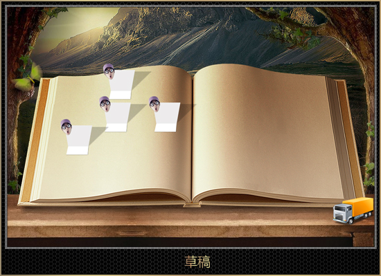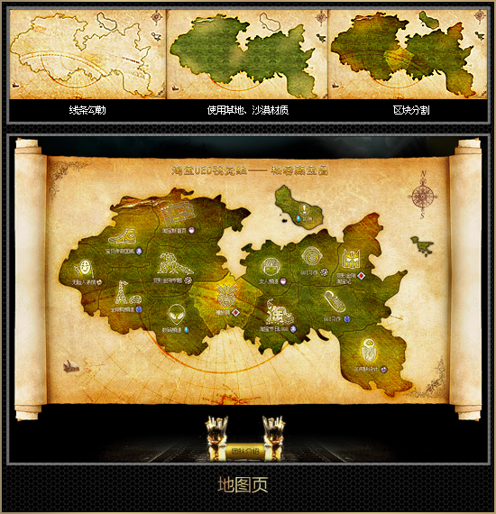 首页页面设想是用一本书作为进入引导页,页面表现需要给人神秘,并且精致,制作初期想到的就是以往一些网游风格的页面.页面上使用了大量的合成素材(如上图).也花费了很多时间,下面是几个制作版本的调整。