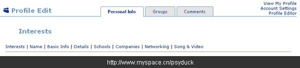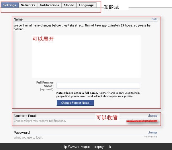优点:在一页内显示,一目了然,便于查找,点击一次保存即可; 缺点:注定项目不能过多,即使精简也会单页过长,且如有网页意外很容易填了很多一下子都没了,且用户看到长长的一页也会感到很绝望。 b)单页收缩展开,如facebook的account ![]() ![]() 优点:可以在一个页面了解所包含的子项,并可以在单页内的下拉框中编辑; 缺点:如果包含比较复杂的子项则需要打开新窗口 c)左侧多tab形式,如雅虎空间 ![]() ![]() 优点:符合传统的左侧导航布局 缺点:对于已有左侧全站导航的网站则不适合。 d)顶部多tab形式,如myspace.cn ![]() ![]() 优点:将各子项分类放置,比较清晰,在填写时如果是step by step引导的形式,则单页内容不多,更能鼓励用户填写完整。 缺点:分类过细不方面用户确定某分类名是否包含某子项;用户填写时需要一个tab一个tab的点击填写,比较麻烦,在初次填写时如果没有step by step的引导,则用户很难主动完成。 因此,或许tab(且有step by step引导)的形式更适合首次的填写,而单页的列表形式则更适合后期的修改管理。 |