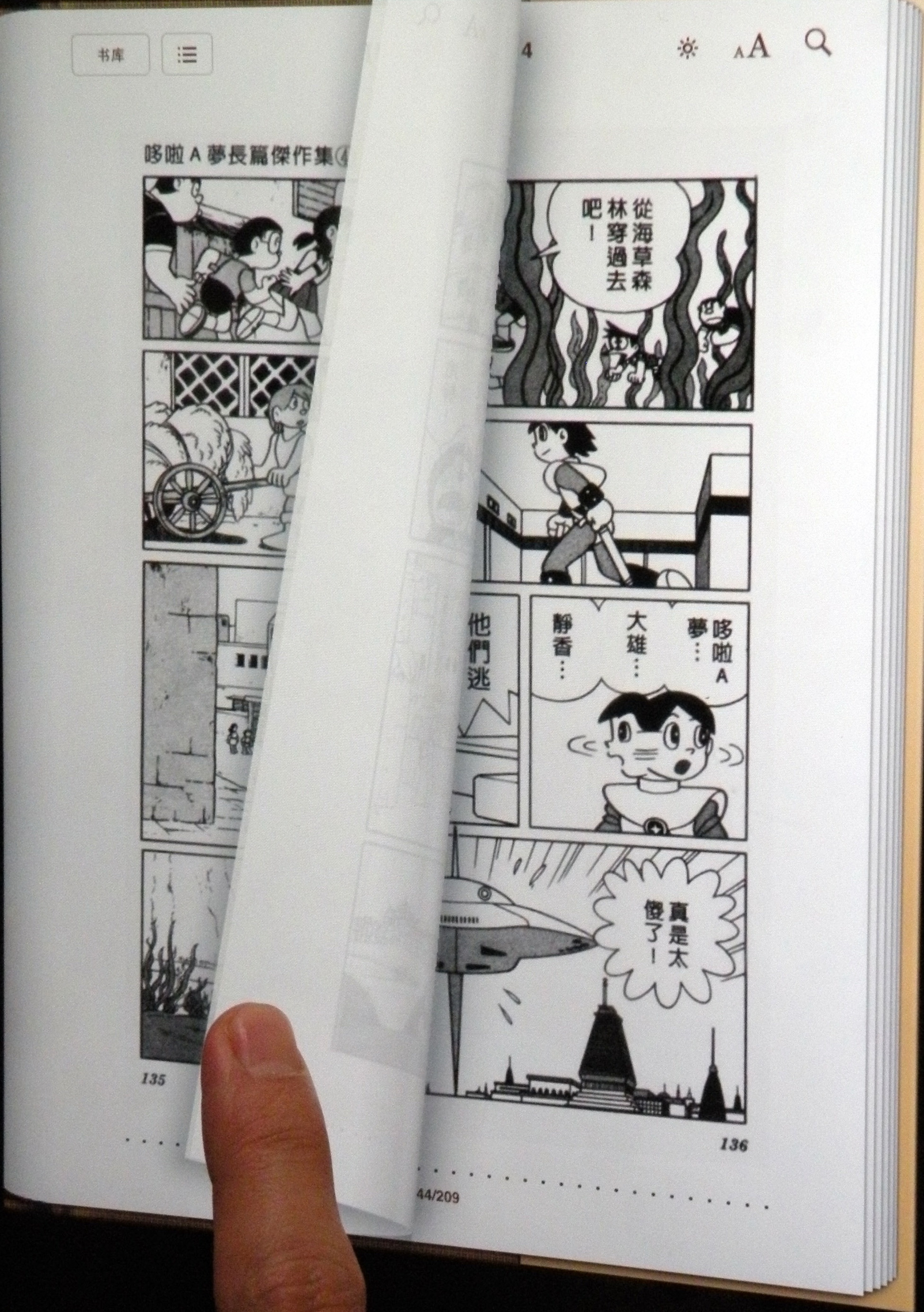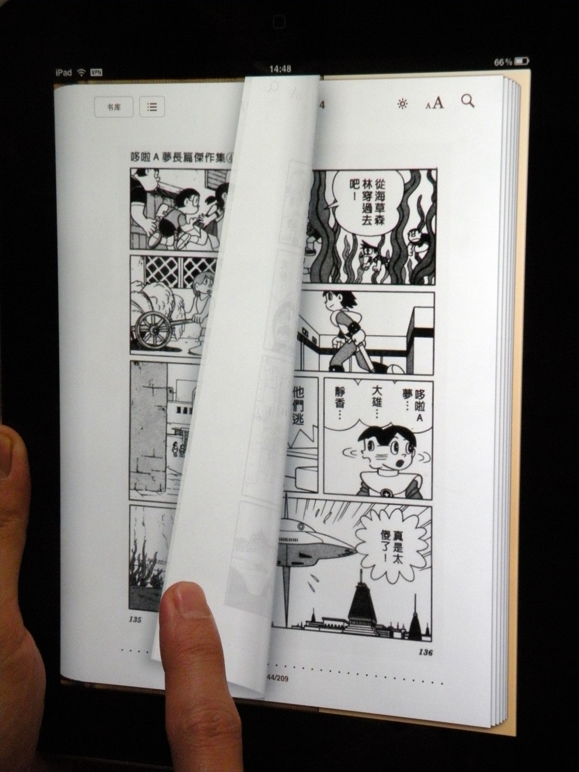 先来看一张照 片,某个iFanr网友正在看漫画《机器猫》(原谅iFanr团队这些“不成熟”的成员们吧,是他们找的机器猫漫画)。不过这本漫画看起来显然和普通漫画 有点不同,因为在书页的右上角竟然有几个图标!回想一下,刚看到这张照片的第一感觉是什么?没错,用iPad看书的时候我也曾有过和你 一样的感受。下面先来揭晓谜底,其实是在一台iPad上看书。 如果单是看 第一张照片的话有多少人能第一时间发现这其实不是一本普通的纸质书?至少它是一本相比纸质书拥有更多功能的书。 无论从图文展示、纸质模拟甚 至翻书效果来看,使用iPad中的iBook程序进行阅读至少看起来效果很棒。至于真书的手感,这个确实是个问题,目前 使用电子设备应该还没发模拟出这样的效果,但毕竟离真书的体验已经很近了不是吗? 和普通电子墨水技术的电子书进行相比,iPad可以在清晰 度、操作性、拟真度和彩色显示方面完胜,尤其是电子墨水还具有让人难以接受的翻页刷新时出现残墨与黑屏(详情见E-Ink刷新实拍视 频)。