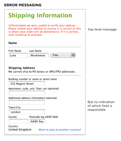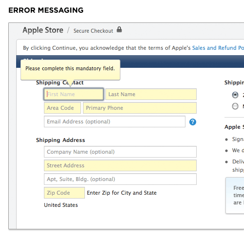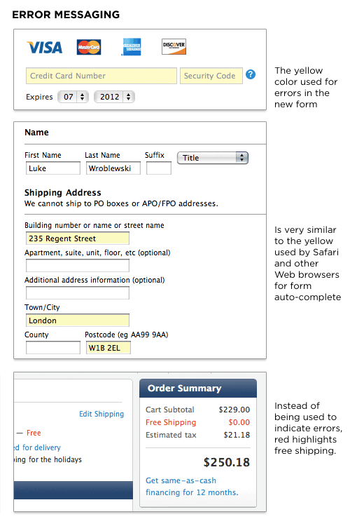 首要操作 正如我们看到的,apple先前的结算表单设计有几个不同的形状和颜色的“召唤行动”的操作按钮。新的设计非常明显地减少了次要操作的视觉重量,将所有的焦点都放到了首要操作上:continue。错误信息 ![]() 错误提示:苹果的新的结算表单还采用了在上下文中的错误提示信息。现在,错误被显示在造成错误的输入区域旁并且提供了清晰的解决建议。然而,将顶部的错误信息提示去除也就意味着会遭遇到一个状态:出现的错误仅仅通过一个浅黄色的背景颜色来呈现。当我修改我的信用卡信息的时候遇到了此问题。信用卡号以及安全码填错了,但是除了浅黄背景外,没有任何提示告诉我。当你考虑到苹果的浏览器(safari)和其他的浏览器,都会使用一个相似的黄色背景来提示那些帮你自动填充好的输入区域时,这个问题尤其让人烦恼。 事实上,在apple之前的结算表单设计中,一个浅黄色的背景就是表达了那些自动完成的输入区域的。而在新的结算表单里,它却用来表达一个错误。为什么apple不使用一个红色(表达错误的标准颜色)呢?哈哈,这也许是保留着为free shipping使用的!