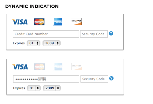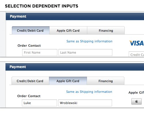 ![]() 你在表单里要求用户回答的问题,都需要他们进行分析、结构化答案,然后填写到相应的输入框里。要警惕每一个你询问用户的问题,去除那些不是绝对必要的问题,或者在更合适的时机、地方询问,或者能够自动推知出来。你问越少的问题,用户更快更容易完成你的表单机会也会越大。信用卡号码遵循一致的结构。美国运通卡号要么以34开始,要么以37开始。万事开头号码在51-55之间。 Visa卡以数字4开始。依此类推。这些信息可用以推断用户使用的是什么类型的信用卡——只要看看他的信用卡号码就可以了。 在重新设计的结算页面,苹果正是如此做的。当有人填写了一个信用卡号码后,对应的信用卡类型也会高亮选中了。这消除了要求用户选择信用卡类型的需要。——减少一个需要用户分析、思考和响应的问题。 关联输入(selection dependent inputs) 关联输入(selection dependent inputs)要求人们在回答了一个问题,基于答案去回答后续的问题——通常不用去另外一个网页上。新的苹果结算表单的付款版块使用了“selection dependent input”方式,在用户选择了付款方式后(Heidi注:用户先选择付款方式的标签),然后需要回答后续的问题。水平排列的付款方式tabs允许用户查看每种付款方式后关联的后续问题。