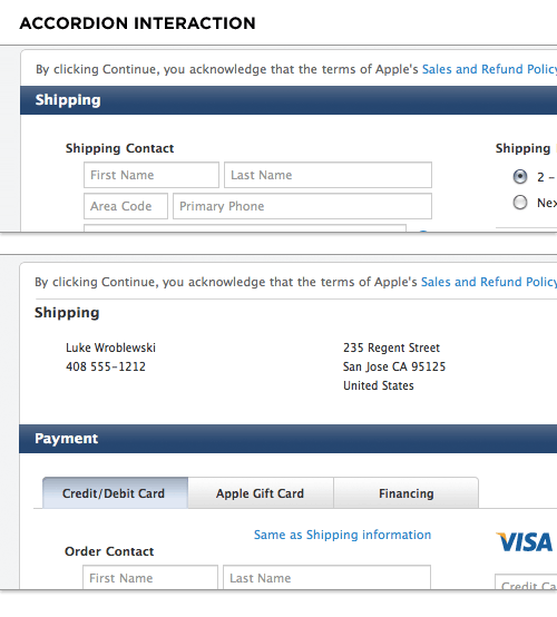 ![]() 苹果重新设计过的结算界面采用了一个“手风琴”式的交互让用户完成一系列的问题。这消除了先前设计中的多个页面和进度条的问题。当人们完成了每一块时,下面的表单也会随即伸开。你可以在apple store上自己体验。 手风琴的设计 Heidi注1:个人觉得apple的收货地址的交互细节做得不错: