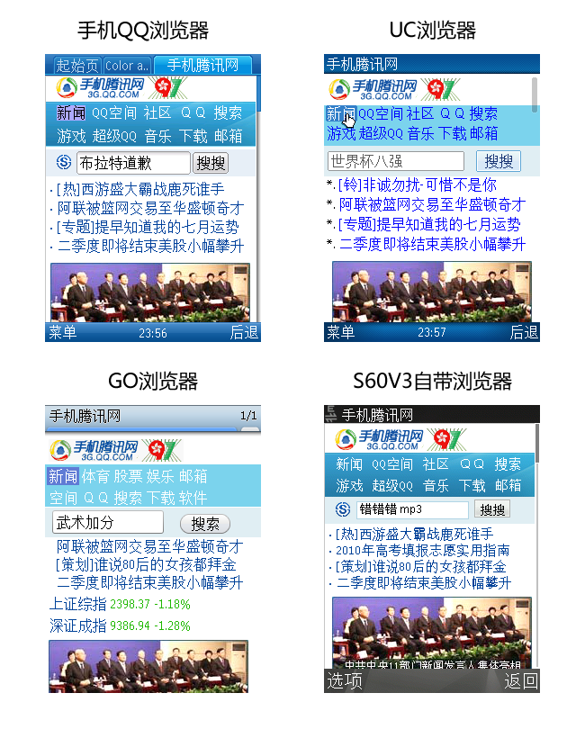 在详细对比各浏览器对CSS支持的差异之前,首先来看一下手机腾讯网在各浏览器下的差异: