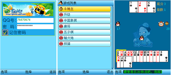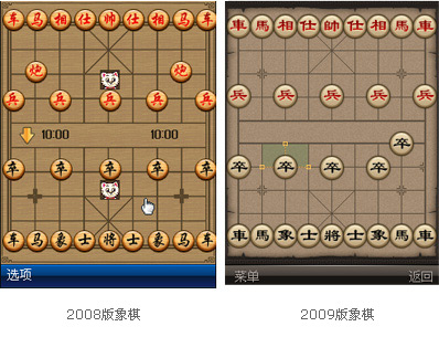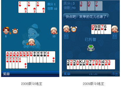 不知道大家一眼能不能看出2008和2009版斗地主的区别呢? 牌类游戏最重要的就是牌,清晰明快的牌面会使户玩起来更轻松,不过手机屏幕的尺寸不比PC,这点上有很大的限制,那么就需要作出取舍,去掉了多 余的元素,放大了用户关注的数字花色, 数字加大了扑克牌之间的间距也加大了,所以优化后的牌面看起来比原来的牌面要小,但是数字花色不是看起来更加清楚呢? 还有一个明显的改动就是聊天泡泡,相比08版现在在最下面的信息栏中更加直观;背景上使用了大的四方连图案填充,背景更加丰富不再单调;优化了 闹钟和托管机器人的设计……等等,更多不同,邀您亲身体验:) 象棋