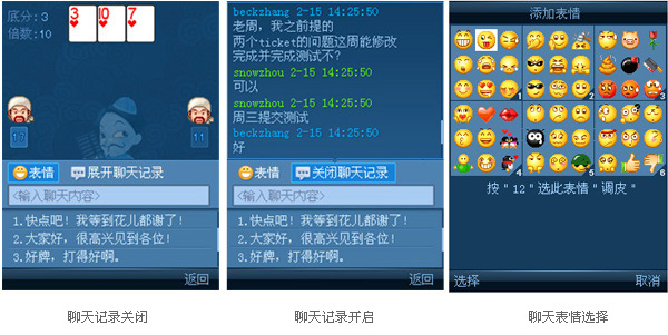 聊天界面这里最先是全屏的,聊天和游戏界面的切换、输入是很麻烦的,后来尝试做成半透明的,但是很影响程序性能,最后决定做成现在这样半屏结构 的聊天框,聊天显示部分的界面是可以开启和关闭的,聊天输入的同时可以看到其他玩家的出牌状态,做到游戏聊天两不误。聊天、表情的输入方式和手机QQ一样 的,只是数量和PC qqgame的是同步的,比手机QQ要少一排 斗地主
