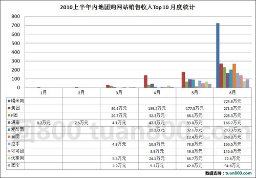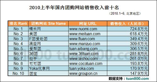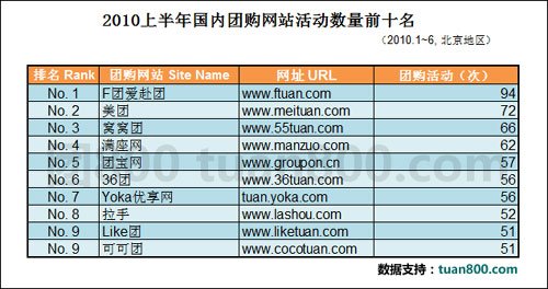 2010年团购类网上购物网站排行榜如果有人在问目前国内网络购物市场最火爆的话题是什么?凡是回答“淘宝”或“秒杀”的,统统拖出去,不解释——显然是“团购”啊,这词在今年的网购市场上咸鱼翻生,概念也有了新的进化,不再是几十个网友在某小区论坛里集体报名代购某地的红枣,而是特指沿袭美国Groupon.com网站的营销方式,在有限的时间里(通常是24小时或2-3天内)推出一个只有原价两折至五折的线下商家活动,通过“名额有限抢完即止”和“每天来看团购都不同”的特色,牢牢抓住了网民的眼球和访问黏度。