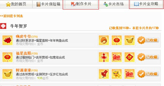 实例三:一个相反的例子,欢乐卡片的应用,制从“我的首页”页面当中,制作卡片的时候需要哪些卡面是在“卡片全攻略”页面来说明的,因此用户在制作卡片的时候需要不断切换到“卡片全攻略”页面来查看需要合成的卡片,因此,在这样的情形下,采用弹出窗口的形式来表现卡片合成向导应该更合适一些。