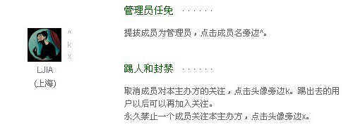 置、删除、相册全部不露声色地做到了前面。成员管理的前台化实践,觉得豆瓣做的挺好,见下图,成员头像旁边应用了管理类小图标,但图标的不清晰,无文字附