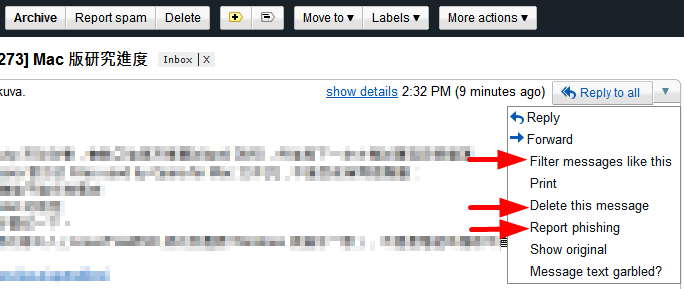為什麼不能回報某串郵件當中只有某一封是垃圾郵件,也沒辦法回報某串郵件通通都是詐騙郵件呢?這大概短時間內我們都不會從 Google 那邊獲得答覆。然而,我們這一趟 GMail 尋幽之旅也還沒結束。 接下來我們要來看看封存/收藏(Archive)的功能。在你的收件匣,工具列上的第一個按鈕就可以讓你封存選定的郵件: 當你發現原來「移動到」(Move to)下拉式選單是這樣用的同時,撇開你一定會產生「那跟隔壁的『標籤』(Labels)下拉式選單的異同是什麼」的疑問不談(這點還蠻容易釐清的,這邊就不贅述),你可能還會有這個疑問: 也許有朝一日,有人會把這些設計寫進什麼教科書,屆時我們就可能可以明白這些介面設計到底是怎麼做出來的了。我還蠻期待的。 |