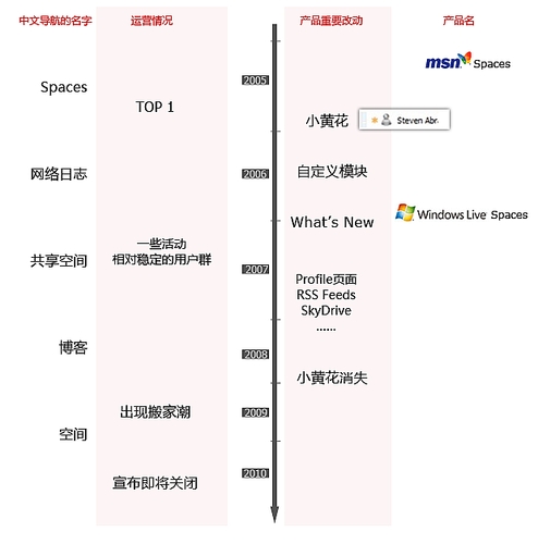 这是一篇最少迟到了3个礼拜的文章。自己约了自己的稿,然后自己不断拖稿,我自己都瞧不起自己了。 话题的引子是这么件事儿:微软上个月宣布将在半年内关闭Live Spaces服务,用户可以转去WordPress独立博客平台(大陆的解决方案还没看到)。一时间用户不知所措,业界也纷纷猜测微软此举用意,更有认为微软全面撤出博客市场。 咱不是微软,真实目的不得而知。但可以看到的是,Spaces的用户不会再写什么东西了,各大博客网站和有博客的网站纷纷出台“Spaces完美搬家”服务,瓜分所谓的“被遗弃的高端用户”。 不去凑那个热闹,咱回过头去看Spaces的发展,相信我们可以学到一些东西。 Spaces走过的路我对Spaces感情比较深,一是因为我自己也曾经在上面写了3年多,到最后搬家到panghufei.com。二是因为曾经管整个淘宝和MSN的合作,MSN方面的很多故事都比较熟悉。 文字阅读障碍的同学看图吧。不过文字应该有不少加工过的信息值得思考。