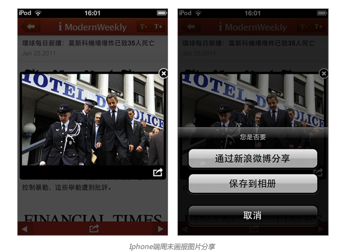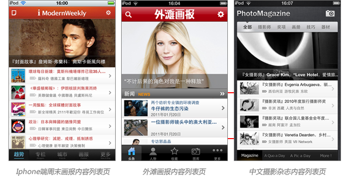 杂志型客户端的信息都通过网络更新,其中一部分直接整合各类资讯网站,而另一部分还是采用传统的杂志创作和编辑方式提供内容。 1, 搜集微博等等来源的信息 而作为中文版的Flipboard的Zaker,其信息则来自国内最为热门的新浪微博,腾讯微博等等信息来源地。 以微博为主的信息来源已经成为中国当下互联网上最快捷最多元化的信息集散地。 2, 自动更新设置 还拥有传统编辑的周末画报也利用网络进行内容更新。每周更新的时间,ios主界面上会有更新的文章数量提示,和app store更新的提示方式一致。 3, 刷新设置 这类刷新设置在杂志类客户端中并不常见,因为杂志客户端基本都以一定的周期进行更新,刷新的作用不大。 4, 离线阅览 不同于大多数在线更新的客户端,周末画报提供了这种可以离线阅览的方式,并且提供了非常简单快捷的后台载入方式,让用户在不知不觉中就完成了新版更新。而色彩设计化的更新进度条,一目了然。 电子客户端区别于传统的纸质杂志,它具有电子化和网络化的特点。利用这些特点创造出独特的电子客户端互动体验,是客户端应用最大的优势。 1, Web2.0时代的评论交流 南方周末ipad阅读器加入了网友评论,并可以实时更新,类似于网页新闻评论。这种互动式的交流会带给阅读者更多的信息。 周末画报的分享功能比较有代表性,可以直接分享至固定微博,也可以保存图片至相册。 2, 动画,小游戏等互动性的体验 BMW宣传电子杂志的一项,可晃动的图像,有相当好的交互性。此处仅仅是一个可玩性一般的游戏,不过考虑到电子杂志客户端的硬件性能,加入一些有意义的互动设计,可以带来传统纸质杂志不能实现的效果。 3, 音频,视频等多媒体手段 南方周末杂志客户端就加入了视频功能。这种手段在杂志客户端中比较常见,也是其区别于传统纸质杂志最显著的特点。 1, iPad端 ipad的面积较大,所以版面设计基本都遵循同时显示多项内容。页面排布按照左右分别布局,基本都配以图片,获得视觉上的统一感和愉悦感。 2, iPhone端 Iphone端由于屏幕面积较小,排版一般以竖屏宽度为列表形式,配以小图,丰富画面。并且可以在顶端大图显示推荐内容。周末画报还提供大图横向拖动,提供了更多的推荐位内容。 对于电子杂志,优秀的交互体验是非常吸引用户的一点。 这其中一些应用采用了拟物的方式来模仿传统杂志翻页效果;还有一些则完全采用电子化的显示方式。 1, 翻页 Flipboard独特的翻页是从中间折起来,同传统的杂志翻页质感很像。区别于此,iphone客户端的翻页一般采用Iphone原生空间,提供了模拟纸张卷页的效果。 而周末画报则提供了最为简单的横向滑动翻页,不模拟真实效果,提供最简单的方式。对于用户来说,也不会造成任何使用上的困扰。 2, 内容知悉 让用户能够在不离开当前页面而知道其他 页面内容并选择跳转,各种杂志客户端都提供了内容知悉的功能。可以在当前页面中打开小窗口看到其他页面的内容。 这其中周末画报以缩略图的形式显示,而flipboard则以标题形式显示。这一定程度上也是两个产品属性不同造成的。周末画报以内容为主,每期的内容量固定。而flipboard以抓取内容为主,内容量不固定,极易超过相当大的数量,如果都以缩略图显示,则容易造成载入过慢,反应速度减缓,从而削弱体验。 3, 图片查看 针对移动互联网独特的阅读需求,杂志客户端都会突出图片阅览。还有专门为图片设计的摄影类杂志应用。 图片阅览模式中,都是以小图进行索引,点击后展开大图,并提供保存以及分享选项。 杂志类电子客户端,通过iphone以及ipad等硬件平台出现而逐渐兴起。区别于传统纸质杂志,它们具有自己特别的优势和特点。合理地利用这些优势,优化体验,可以创造出非常优秀的产品。 了解用户的阅读习惯,理解电子平台的独特属性,通过结合和平衡得到最佳的应用效果,是每个设计师必须尽力学习和实践的。 |