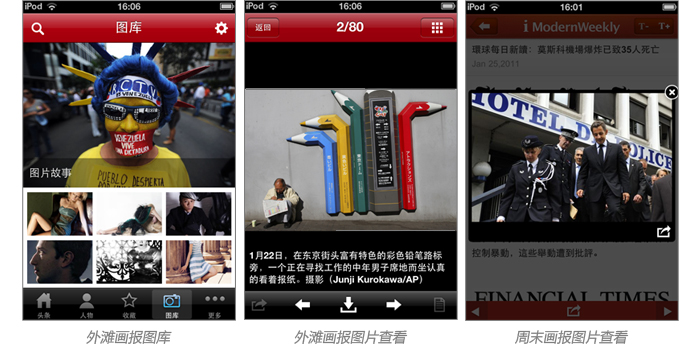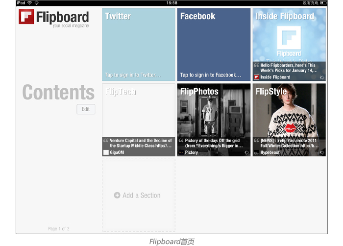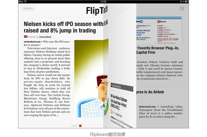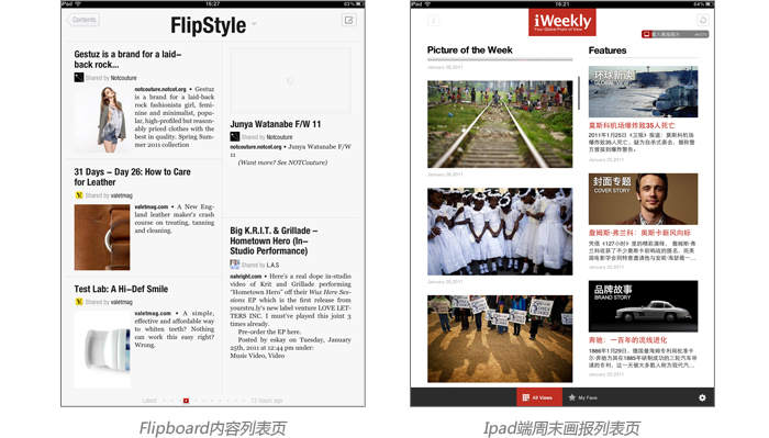 随着苹果iPad的推出,电子杂志类行的应用大受好评,电子阅读需求量不断增长。传统纸质出版物的良好的视觉效果,互联网巨大的信息资源库,将这两者集合在一起就会诞生非常好的杂志客户端应用。这种杂志型客户端应用的最佳代表就是Flipboard。 2010年iPad最佳应用是Flipboard。集合了Facebook和Twitter的推动内容,辅以格式排版,让用户得到了无限量的优秀资源以及良好的阅读体验。 2010年国内也涌现了非常多的优秀的杂志型客户端应用。包括周末画报,外滩画报,Flipboard的中文版——Zaker等等。以下将对这些应用做一个特点总结,分析其设计上的闪光点,希望能够对相似的产品在设计上起到一定的借鉴作用。