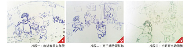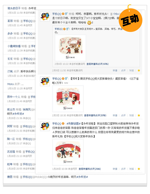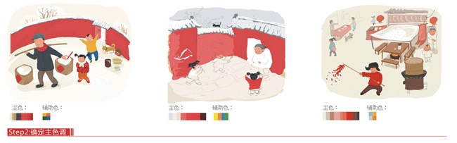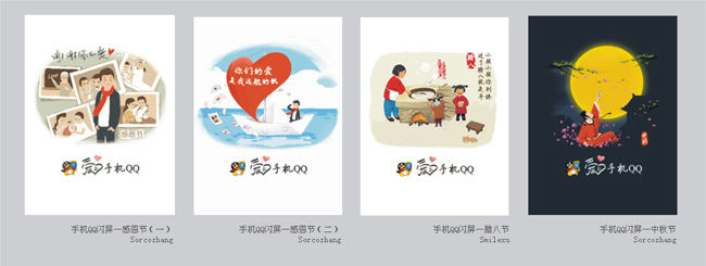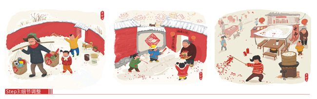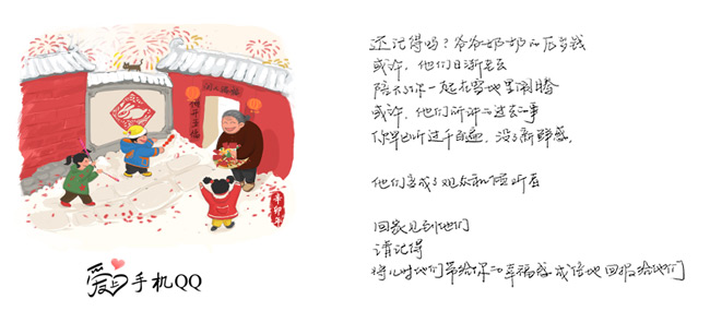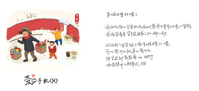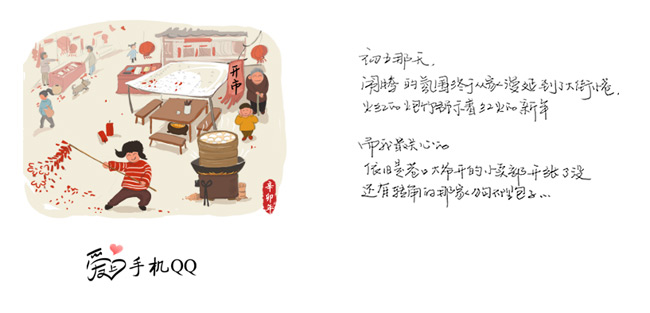 【引】: 过年咋样?玩得开心吧? 你是不是也换了n套衣服参加各种聚会;你是不是赶了n趟赶饭局;各种暴吃,闲话扯谈,油腻和二手烟,还有二姑奶奶三婶四舅的各种八卦爆料…整个假期,似乎都充斥着麻将的噼啪声和香烟酒精瓜子的腻味。 真的开心吗? 和春节一样,我们传统节日的氛围好像越来越淡了,就连过年都似乎成了一种借口,借机多喝一盅,多玩两趟。有些“节目”似乎也成了必不可少的桥段和必走的流程。 手机QQ2010春节系列闪屏就出自这样的背景下:关于年味渐淡的思考,关于回忆中的年。 当接到设计需求的时候,说实话并不知道从哪里开始下手。输入关键字“过年“搜出来的图片到处是各种热闹的场面: 顿时满脑子都是大红大红的颜色,就像各大超市的节日折扣卖场,热闹非凡。只是,这热闹无非都是些烘托节日氛围的造作罢了。除了生活中这些实物照片,还有很多个人网站,门户等网站也都换上新装,以此提醒新年的到来: 如果手机QQ的闪屏也和这些网站一样加上烟花爆竹、拉上对联、整个红包、兔子、然后涂上一屏大红色,这种以制造过年氛围为目的,形式化的表现怎么能够体现“关怀“的初衷?手机QQ闪屏是因“用户关怀”才开始,我们的“关怀”如何让用户感知? 【想法来源】: 正当挠头抓耳时,看到了好友更新的一则说说:过年回家,一次对亲情的朝圣。 这句沉甸甸的话背后,促使我开始重新考虑过年回家的意义,对手机QQ春节的闪屏有了另外的一些想法。组内小范围的讨论,大家也都对于小时候过年的印象更为深刻。 想想你的孩童时代,那种翘首期盼倒数计时的心情;那些放假疯狂游戏的玩伴;那种拿到红包最后却要充公的失落;穿上新衣服见表哥表姐的期待;和那段一个糖果一个炮竹就可以满足的年纪;连同那些大片大片空闲的时光都随着年龄的渐长,一哄而散。 在网上搜索,也有网友也曾针对“年味渐淡”的话题发起过很多类似的讨论。我们有很多共通的回忆:玩炮仗的各种新鲜玩法、新年新衣、拜年红包、用压岁钱买的游戏机…等等。 长大前后的春节对比,美好似乎都停留在了那时候。至于为什么会有这样的改变,我们不做过多的讨论。这种被遗失的美好,或许可以尝试在闪屏中表现。 于是,手机QQ闪屏的大致方向也定为:回忆中的年。 让早已对过年感觉油腻的“我们”,再回味一下我们儿时的年,同时,这些促使我们对于“亲情的朝圣”和“成长的礼赞”的思考:如果你将过年回家看成是一次对亲情的朝圣,那也是一次对成长的礼赞。应该庆幸这样的成长,因为终于可以保护曾经保护你的人,为他们撑一次伞,挑一次担…这也是我们这次春节系列闪屏希望传达给用户画面外的意义。 那么,在小小的手机的屏幕上以怎样的手法呈现,能让用户在3~5秒时间里感受到。于是,简单将这些被提到的事物和主要事件进行罗列。选取其中最有代表,共性最大的元素。依据印象中最深刻的画面,以时间为线索,划分为三个片段: 片段一:临近春节办年货 片段二:万千期待领红包 片段三:初五开市始闹腾 为什么是这三个片段呢? 主题定位:回忆中的年。 由此我们将贯穿系列闪屏的主体定为孩子的视角,以孩子为中心。办年货——对于零食的期待,领红包——可以有自己数额较大的零花钱,初五开市——店铺开张,支配零花钱。 闪屏的制作: 根据三个故事场景,拟出故事人物,地点,事件。同时,考虑到春节闪屏为一个系列,所以在画面的延续性上也有考虑。以孩子作为贯穿故事画面的不变元素,添加事件主体人物,其它则为点缀。 由此,画出草图: 除了故事的选择,在色彩的处理上,也有考虑:选取什么色调表现。 当我们google“过年”得出的图片结果是这样的: 一大片扎眼的红色,热是热闹了,可是感觉很“生”,视觉上其实并不好受。另外,对主题而言,RGB: R=230, G=0, B=0(CMYK: C=0, M=100,Y=100,K=10 )的中国红对“回忆中的年”的主题表现并不适合。于是考虑重新选取红色色值。 查找了很多图片发现,以稍微带点怀旧的红色,比较适合主题的表达,同时,由于手机屏幕的各种偏色问题的存在,中国红有风险,带旧一点的红色在手机屏幕上显示,不至于太过扎眼。 我们从传统画中去寻找这种红: 选取认为比较适合闪屏主题的几种基调色,整套设计以此作为画面的主色,适当加入部分协调色,这个依据不同画面而定。 故事场景,人物,和色调有了大的支架之后,开始制作: Step1: 以孩子为画面视觉引导,每个画面都选择一个视觉中心点。加上部分烘托画面氛围的视觉元素,不宜繁琐。 Step2: 利用之前提取到的颜色铺出整体大调子,适当调节主色在画面上所占比例,结合不同的片段让画面间形成一定的差异。 Step3: 大的基调确定好了之后,远近的虚实与画面的取舍把握。细节的处理上可以下一番功夫,除了在表现上的调整,还可以考虑一下画面趣味性的提升。比如,在画面中都加入很生活化的事物。院子的狗、围墙上的猫、蒸笼里的包子…这些元素的加入,会让整个画面看起来更有味道。 【包装与传播】: 【用户反馈】: 此次闪屏也被用户所喜爱,关注并传播。 其实,不光是这次春节的系列闪屏开始倾向“人文”与用户情感互动,在之前的几期闪屏中,我们就已经开始偏向“人文”精神。如中秋节,感恩节等。 【对于“人文”的思考】: 越来越多的广告在寻求与用户的情感共通,不论是电视媒体还是平面媒