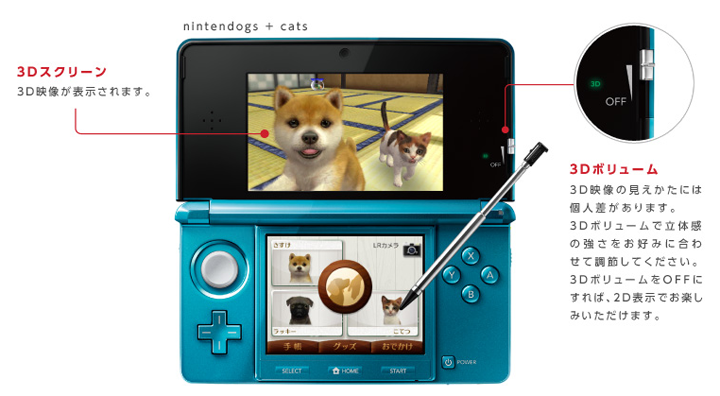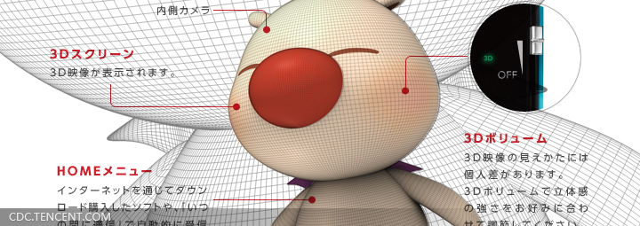 “Nintendo3DS 影像是用左右目视差的原理来生成立体感的。但是观看3D 影像是存在个人差异的。比如左右眼视力差大的人 ( * 1) ,因人而异看到立体影像可能会有一些难度,也有可能存在完全看不到立体影像的情况。Nintendo 3DS 为了能让更顾客享受 3D 影像带来的乐趣,引入了3D Volume 控件。3D Volume 向下滑动,影像的立体感会渐渐削弱 ( * 2) 。滑到最下方,看到的将是完全的2D 影像,这使喜欢用2D 影像来玩游戏的人也可以享受这个过程。