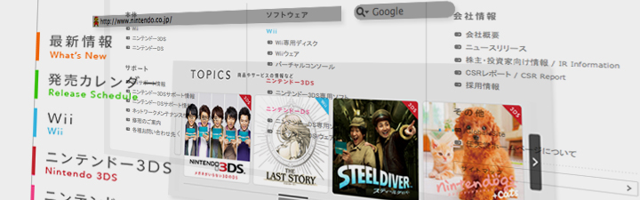 但是在3D 世界里,上面这种问题就一下子变得不是那么的明显了。原因就是,3D 空间的信息不再只是可以向上下左右扩张性的平铺,同时也可以纵向的进深。控件不再和页面内容抢占一块地盘了,它们会分布在不同的层上。甚至网页本身的内容,也可以分布在不同的层上。所以可能连网页设计也与现在大不相同了。这样,我们所有的Layout 和交互都将变得不同。进行创意的空间也变大了。当然,目前更多的应用3D技术的还是电子娱乐领域,在这里,扩展新奇的娱乐方式是必不可少的。Nintendo作为一个老牌公司,一直很看重游戏性和创意,在这里祝他们大卖~